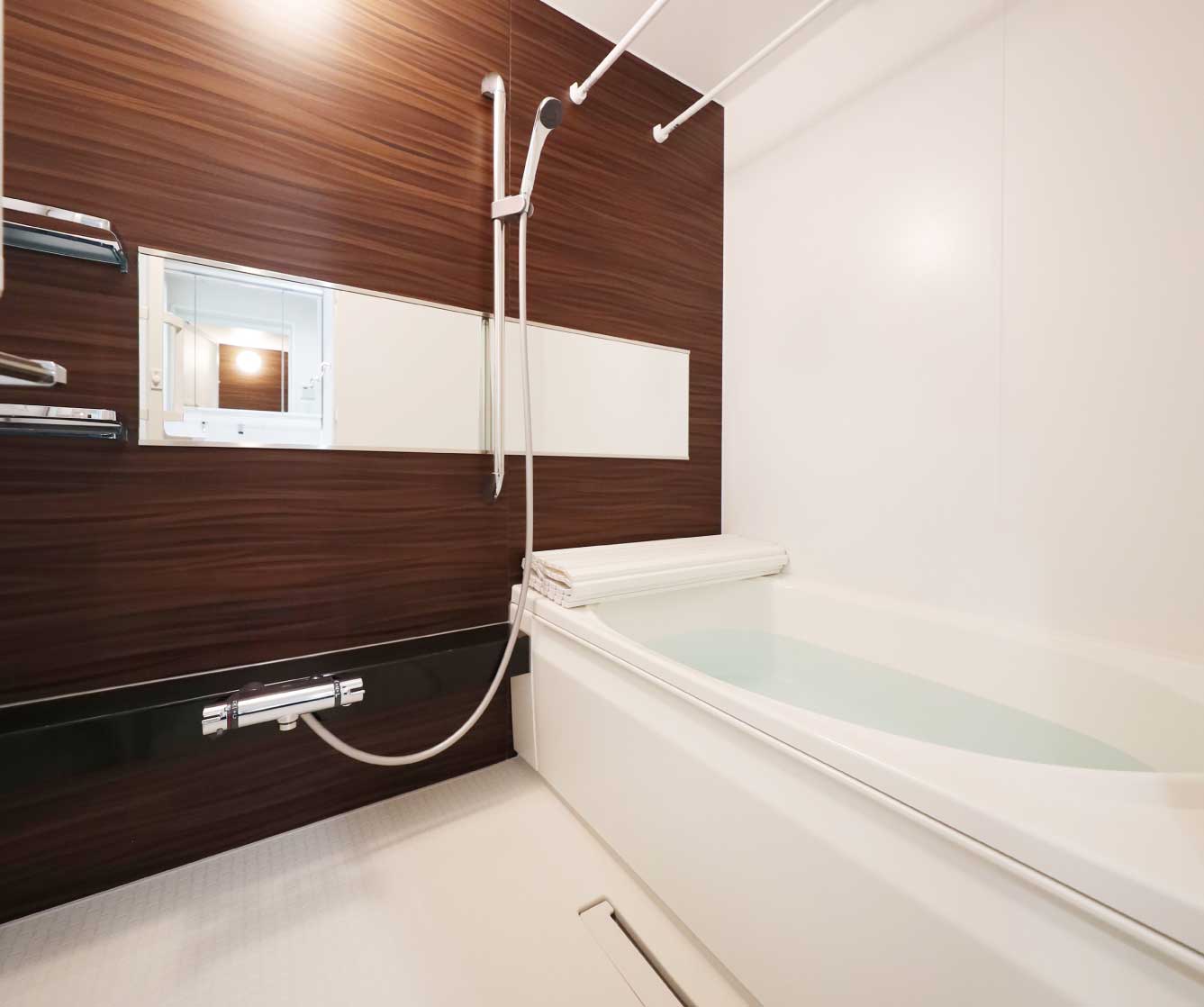 バスルームに設置された横長のミラーで、広く開放感のある空間を演出します。