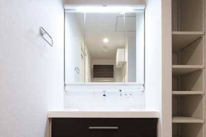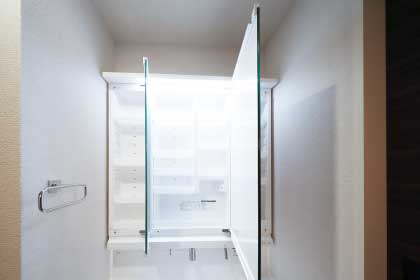 三面鏡の裏側には収納棚を確保。スキンケア用品やヘアケア用品などをすっきり整理できます。。